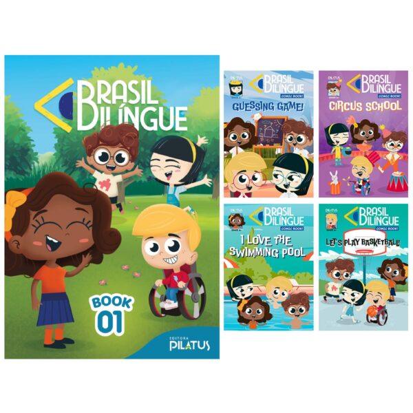 VERSÃO DIGITAL: MATERIAL DIDÁTICO E PARADIDÁTICO – BRASIL BILÍNGUE – BOOK 1 (1ºANO) + Coletânea de apoio ao desenvolvimento de língua estrangeira (Kit com 4 gibis, sendo 1 por bimestre) ( 1º ano – Anos Iniciais). Livro para ensino de língua inglesa indicado para crianças de 6 anos (1ºano) com atividades de coordenação motora, reconhecimento das letras, música, atividades de recorte, adesivos e contextualização com outras disciplinas. O aluno vai despertar para um mundo cheio de aventuras com nossas mascotes e no idioma inglês!