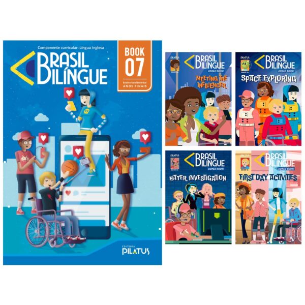 MATERIAL DIDÁTICO E PARADIDÁTICO – BRASIL BILÍNGUE – BOOK 7 (7ºANO) + Coletânea de apoio ao desenvolvimento de língua estrangeira (Kit com 4 gibis, sendo 1 por bimestre) ( 7º ano – Anos Finais). Livro para ensino de Língua inglesa de acordo com orientações de conteúdo da BNCC, indicado para crianças com 12 anos (7ºano). Oferece metodologia que incentiva a prática oral com áudios e atividades de interação com a língua inglesa. Com mascotes que acompanham o desenvolvimento físico e social dos estudantes, aprender inglês fica muito mais fácil!